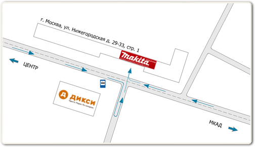 Если вы едете из центра, то Вам надо повернуть на светофоре в первый поворот направо после Третьего Транспортного Кольца и припарковаться у магазина Дикси. Парковка рядом с нашим магазином не разрешается. Затем пешком перейти улицу и в середине дома найти вывеску Электроинструменты Makita напротив магазина Дикси. Первый этаж направо.